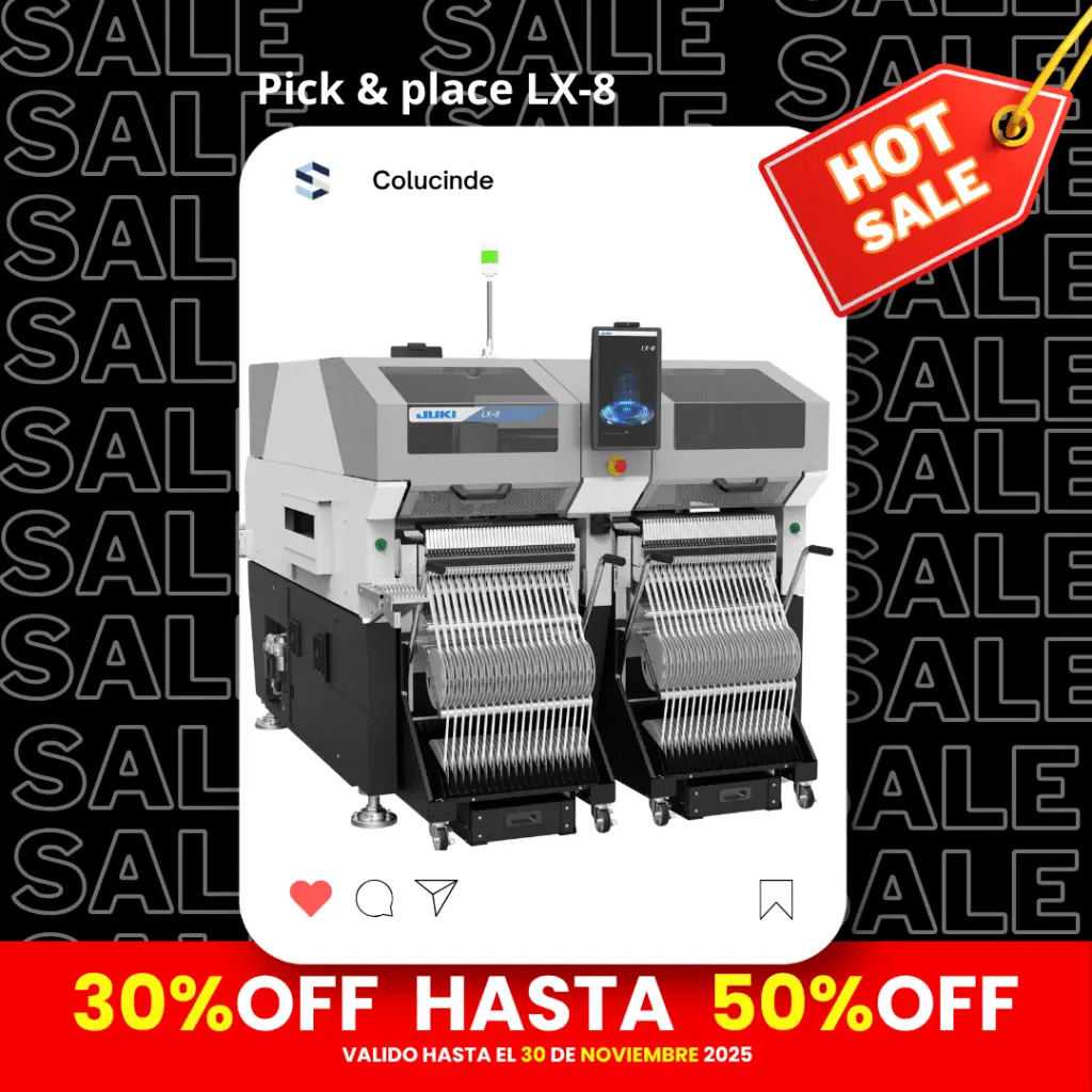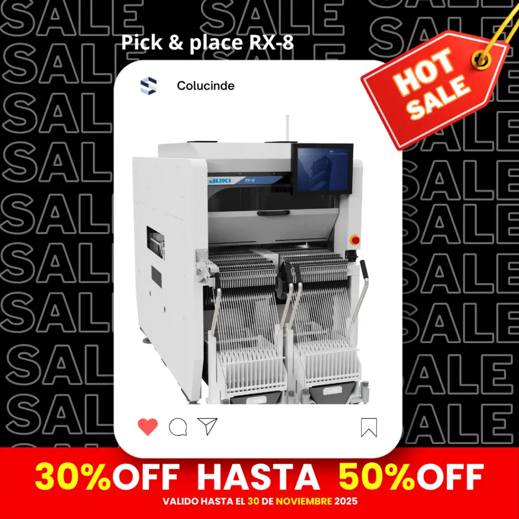 - Versatilidad: soporta desde 0201 hasta componentes de ~5 mm; PCBs hasta ~510×450 mm (modo estándar)